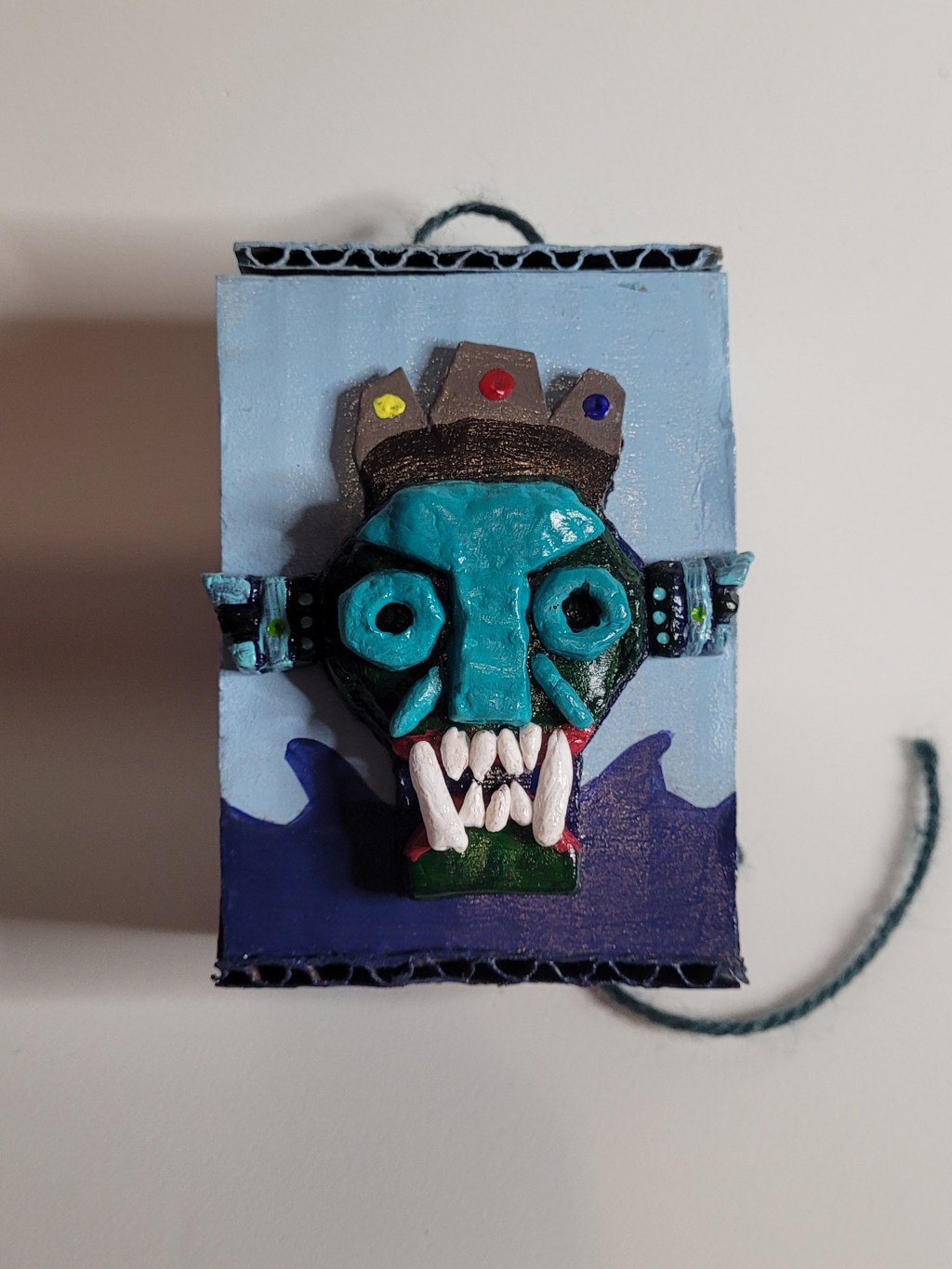 You know, originally I had the suns on his crown be little balls of clay painted and glued onto the sculpture, but they kept breaking off so I just decided to paint the suns onto the crown. It’s a shame that the original idea I had for this piece as a key box didn’t really work out, but I suppose complications are to be expected in the creative process. And the final product turned out fairly nice as well, which is neat.